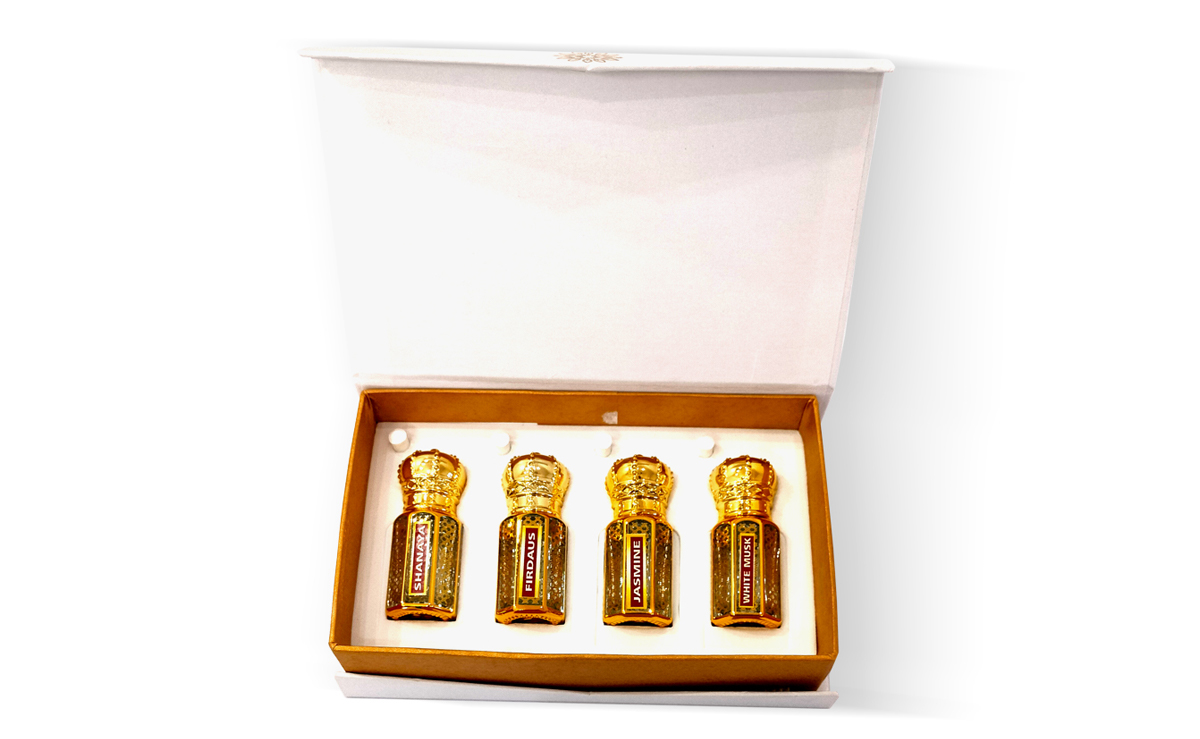 White Gift Box Mauryaa Fragrances Shanaya, Firdaus, Jasmine & White Musk Attar for Men & Women Unisex Alcohol Free Itar/Itra Perfume Combo Pack of 4 for Diwali Gifts for Family an Friends (Copy) – Mauryaa Fragrances
