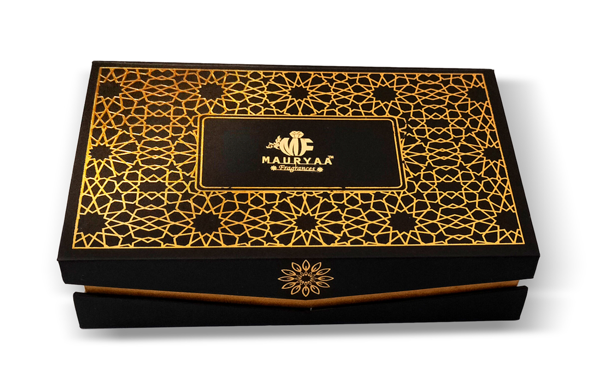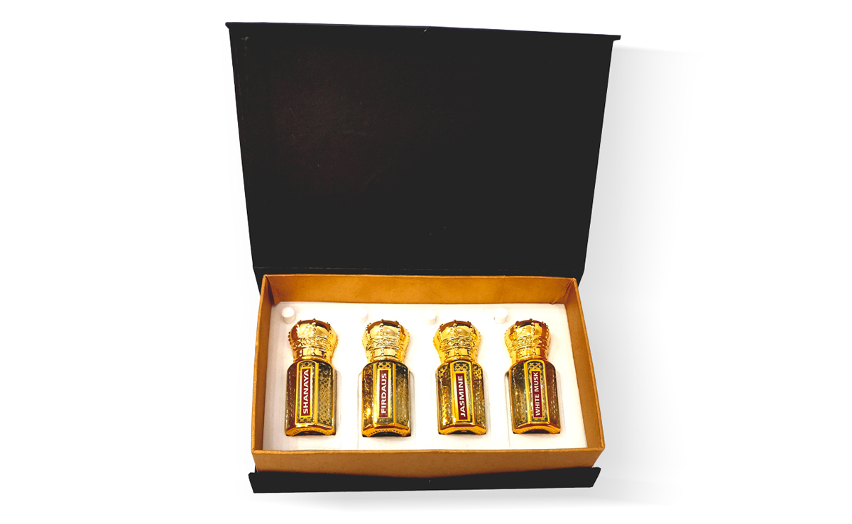 Black Gift Box Mauryaa Fragrances Shanaya, Firdaus, Jasmine & White Musk Attar for Men & Women Unisex Alcohol Free Itar/Itra Perfume Combo Pack of 4 for Diwali Gifts for Family an Friends – Mauryaa Fragrances